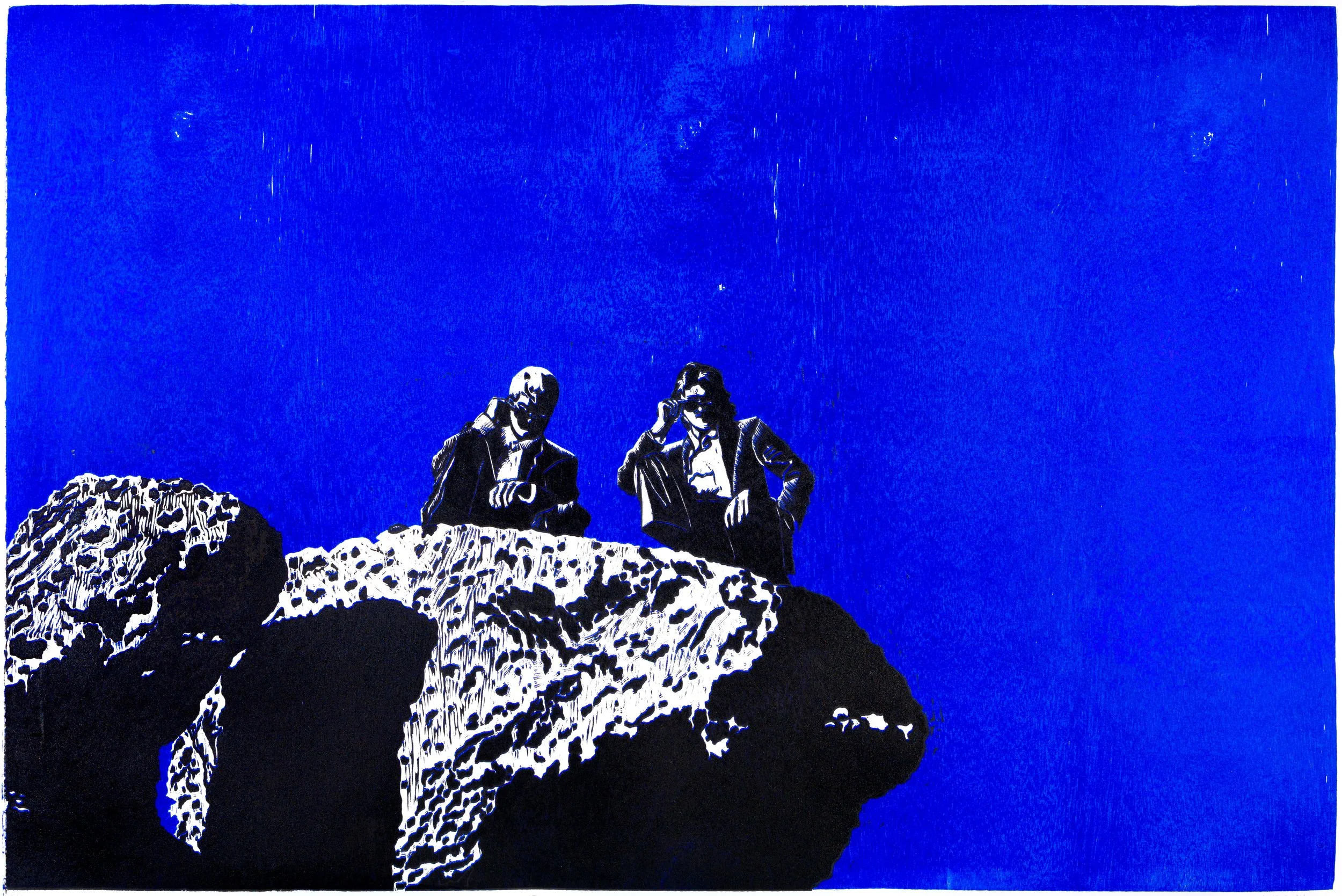 I’m a printmaker working in a variety of mediums; woodcut, linoleum, wood engraving, and copper plate etching. I am always looking for new ways to play with the material and colors available to me. The print pictured here is a self-portrait of me (right) and my brother dressed as the Men In Black. It measures 36×48” and was carved as a reduction print in plywood.